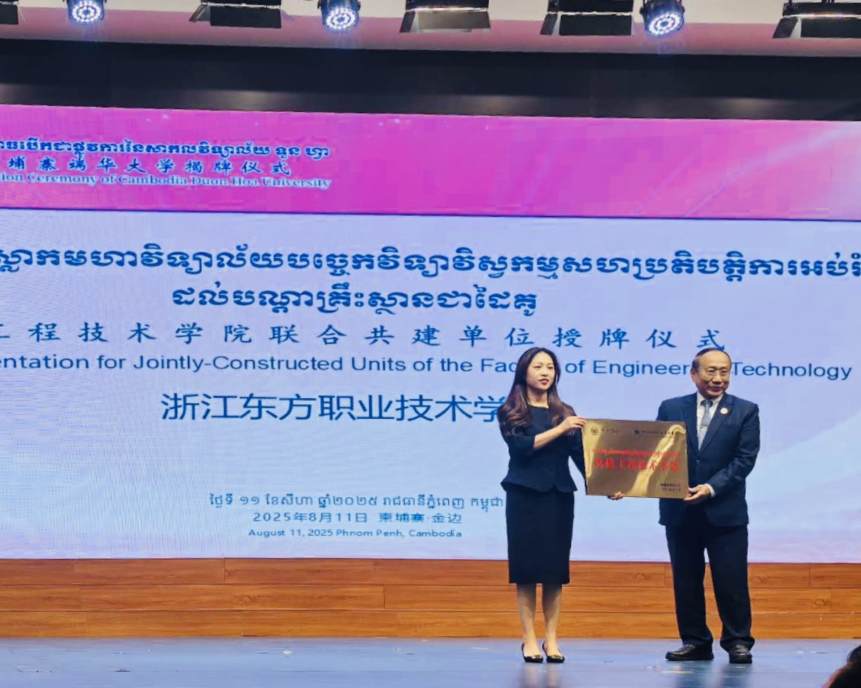 为服务国家“职教出海”战略,深化中柬教育合作,8月11日,浙江东方职业技术学院首个海外工程技术学院在柬埔寨端华大学开学典礼上正式揭牌成立。