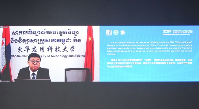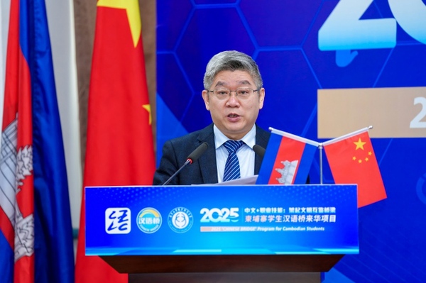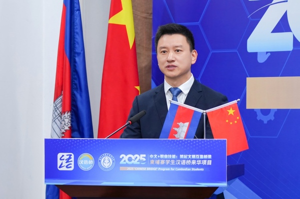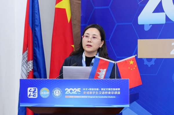 金尚军代表江苏省人民政府外事办公室向本次项目的顺利开营表示祝贺。他指出,中国和柬埔寨是真诚互信、守望相助的铁杆朋友,江苏始终将柬埔寨视作“一带一路”沿线的重要合作伙伴,双方在贸易、投资、教育、医疗等领域的务实合作成效显著。南京工业职业技术大学在柬建设了柬华应用科技大学,承办了多项教育人文活动,主动对接柬方的技能人才需求,为柬埔寨高素质青年人才培养做出了积极贡献。2025年是两国领导人共同宣布确立的“中柬旅游年”,本期汉语桥项目的举办正当其时。希望各位以此项目为契机,感受中国发展,传承中柬友谊,为共建中柬命运共同体贡献自己的智慧和力量。江苏省外办将不断丰富职业教育领域合作的形式和内容,赋能经济社会发展,促进两国民心相通。