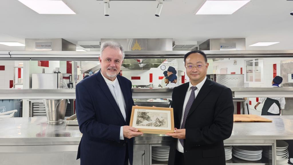 在柬埔寨烹饪艺术学院,代表团参观了该校烹饪实训室及相关设备,与校方就烹饪专业合作办学进行现场交流。双方围绕课程设置、实训基地建设、师资交流等内容达成多项合作意向,并就师生共同参加“湄公河美食节”、共建特色烹饪课程等事宜达成共识。交流中,中柬双方烹饪专业教师还开展了中西餐饮烹饪及服务技术研讨,相互借鉴教学与实践经验,为烹饪专业人才培养质量提升提供有力支撑。