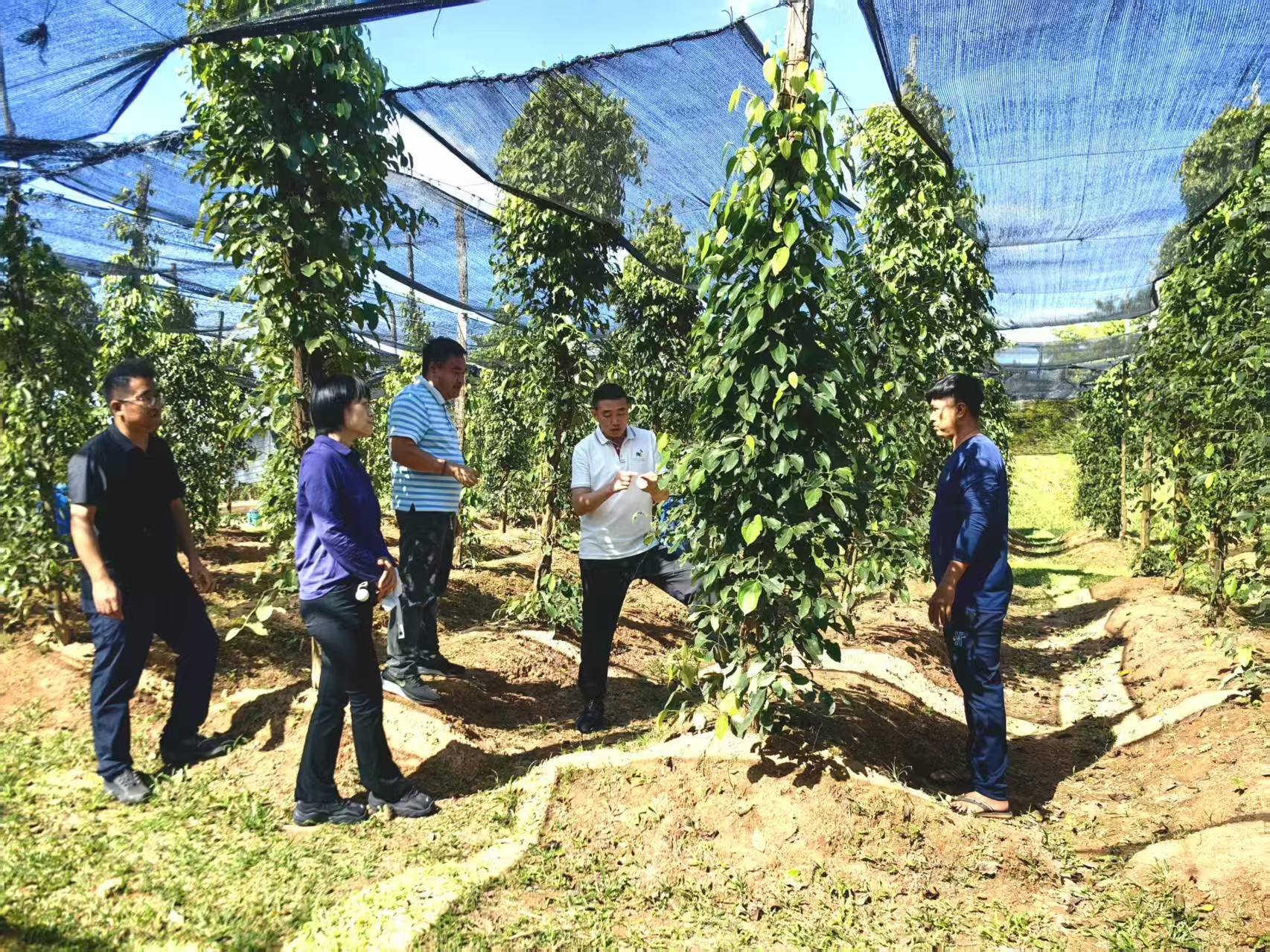 中国专家团队在柬埔寨贡布省白马市胡椒农场开展胡椒种植技术指导。中国热带农业科学院香料饮料研究所 供图