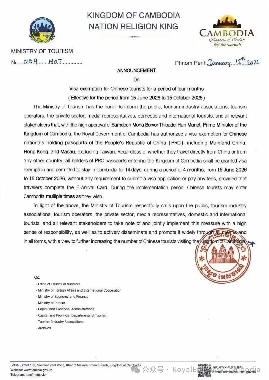 1月15日,柬埔寨王国政府旅游部正式发布《关于对中国游客施行为期四个月免签试点的公告》。