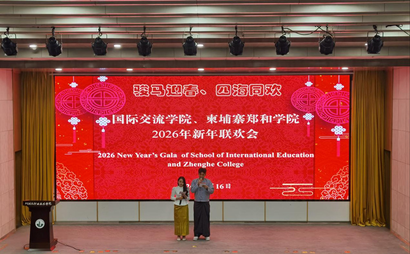 1月16日下午,国际交流学院、柬埔寨郑和学院2026年“骏马迎春、四海同欢”主题新年联欢会在图书馆报告厅热闹开场,各职能部门、二级学院相关负责人,同国际交流学院全体师生欢聚一堂,共迎新春。
