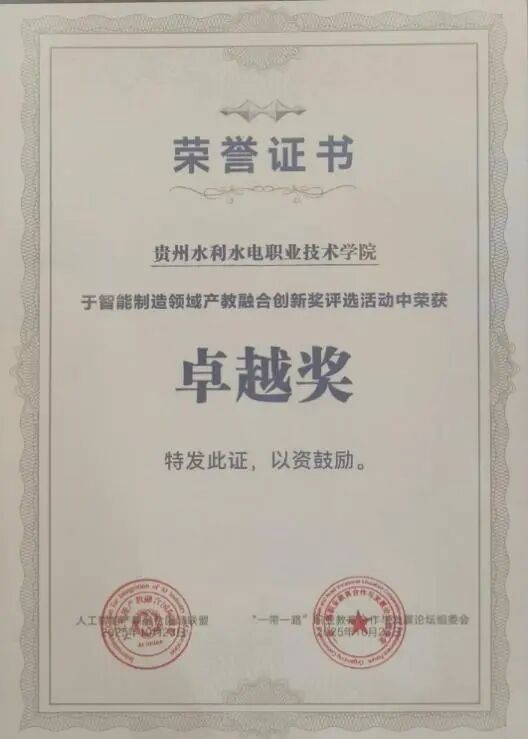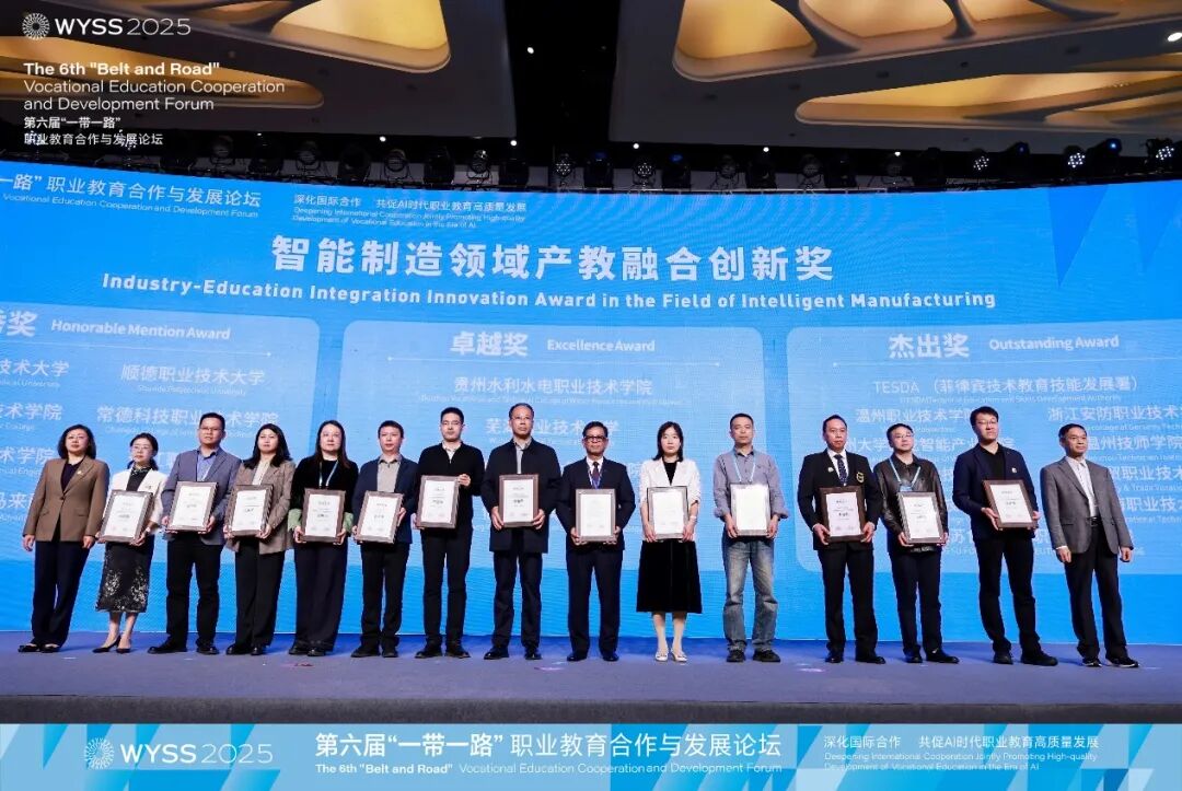 在成果表彰环节,贵州水利水电职业技术学院凭借智能制造领域产教融合的创新实践与成效,荣获“智能制造领域产教融合创新奖卓越奖(一等奖)”。这不仅是对学院探索AI技术赋能职教、推进产教协同育人的高度肯定,更为学院进一步深化国际职业教育合作注入强劲动力。