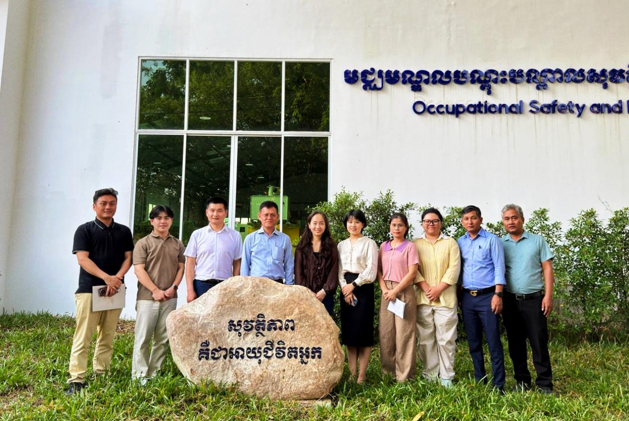 随后,代表团到访柬埔寨劳动和职业培训部职业安全培训基地,与柬埔寨劳动和职业培训部职业安全健康司副司长Yi Kannitha及相关部门代表展开交流,就职业安全培训项目开发、在地化人才培养、培训资源共享与师资交流等合作事宜达成共识。代表团实地考察了基地理论教学区、安全实训操作区等功能区域,调研当地职业安全培训体系与考核模式,结合学校基地建设与运营开展现场交流,为双方联合开发汽车、机电制造领域职业安全培训课程,协同培养兼具专业技能与职业安全素养的本土化人才奠定基础。