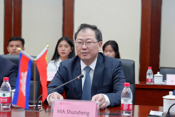 马顺圣代表学校对代表团一行的来访致以热烈欢迎。他表示,柬埔寨是中国政府提出的“一带一路”倡议沿线的重要国家,中柬文化交流源远流长,两国有着广泛而深入的合作基础。教育合作是中柬两国人文交流中最重要、最活跃的领域之一。扬州市职业大学作为教育部高职高专人才培养工作水平评估优秀院校、江苏省中国特色高水平高职学校建设单位,高度重视与“一带一路”国家高校的国际交流与合作,也取得了卓有成效的合作成果。他指出,本次柬方来访,为双方多层次、多角度、多渠道密切合作带来了新机遇、提供了新动力。我校将始终秉持共商、共建、共享的基本原则,继续发挥学校专业和人才优势,全力支持与柬埔寨公共工程与运输学院的合作交流项目,切实推进双方在学生培养、师资培训等领域的合作。他希望,双方以此次合作交流为重要契机,通过开展文化交流、语言培训、专业研讨等一系列活动,进一步加强中柬跨文化人才培养体系构建和产学研交流合作,推动两校国际技术技能人才培养迈上新台阶,共同谱写中柬人文交流新篇章。