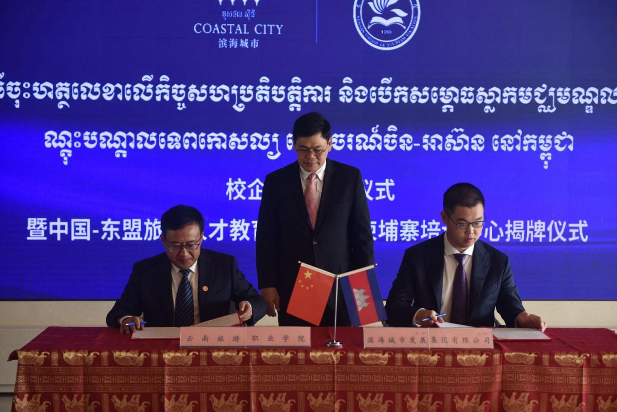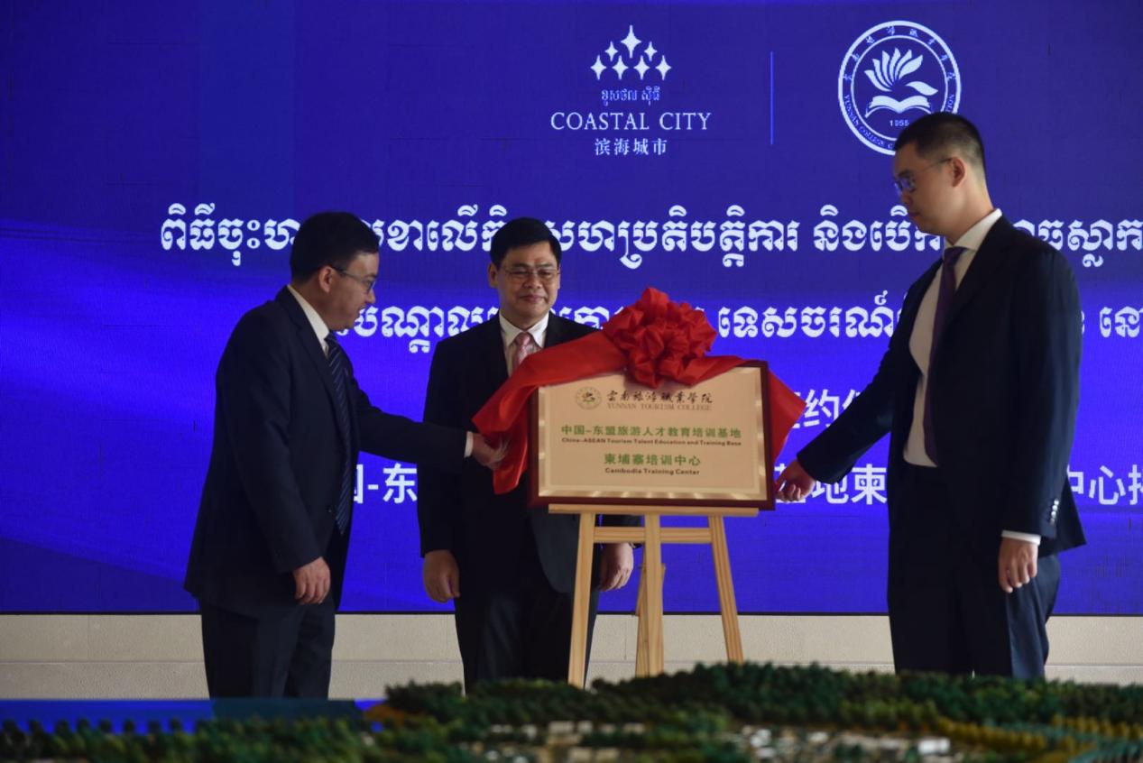 会谈结束后,在国务秘书H.E.OM ROMNY的见证下,我校与滨海城市发展集团有限公司签订了校企合作协议,揭牌成立了“云南旅游职业学院:中国-东盟旅游人才教育培训基地柬埔寨培训中心”。此举不仅标志着我校在教育国际化进程中迈出了坚实的一步,更是积极响应国家“一带一路”倡议,服务旅游产业发展,促进中国与东盟国家文化教育交流与合作的重要实践。