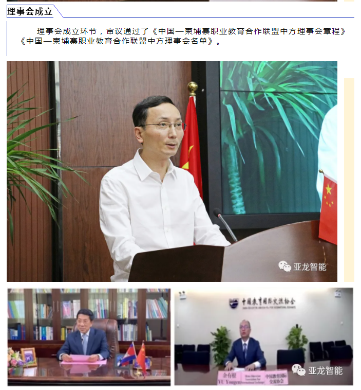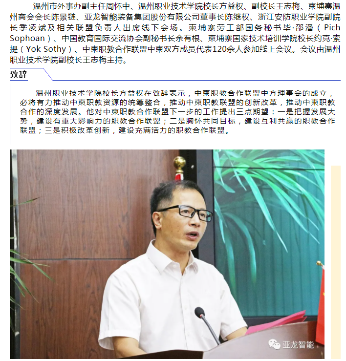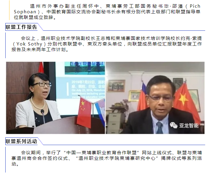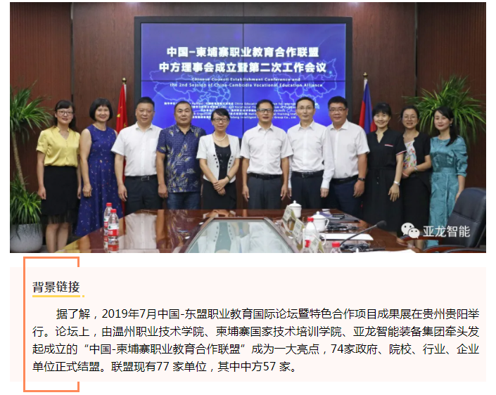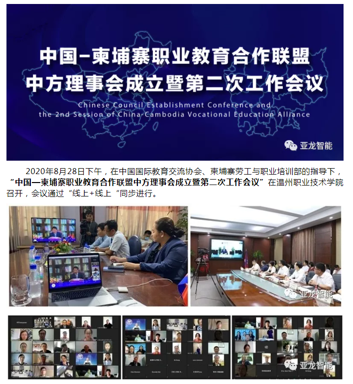 相关链接:中国—柬埔寨职业教育合作联盟中方理事会成立暨第二次工作会议在温州职业技术学院成功举办-新闻动态-亚龙智能装备集团股份有限公司