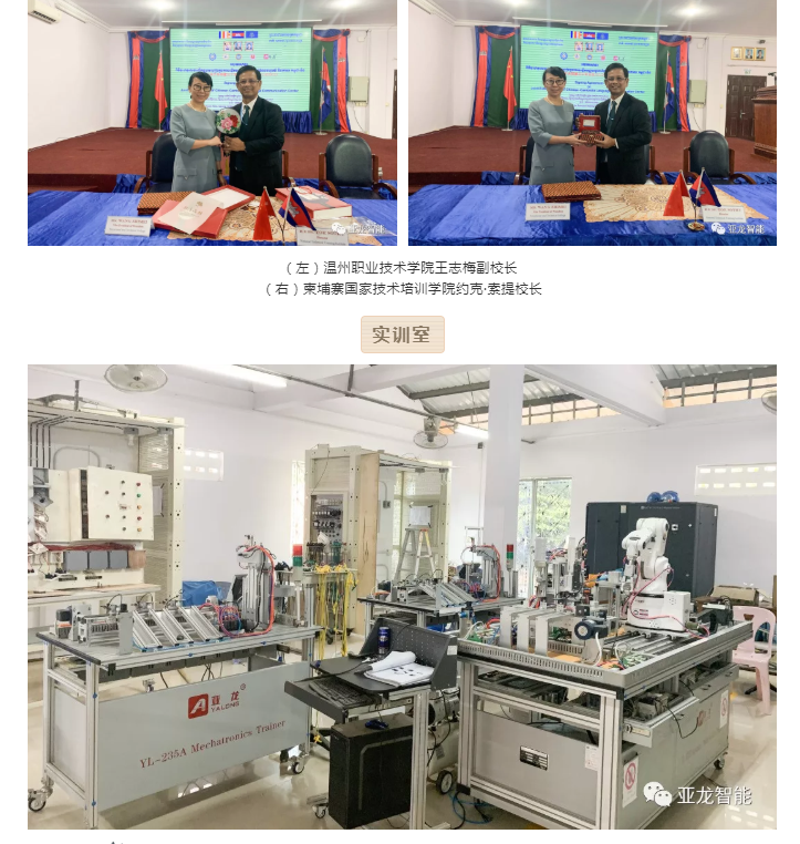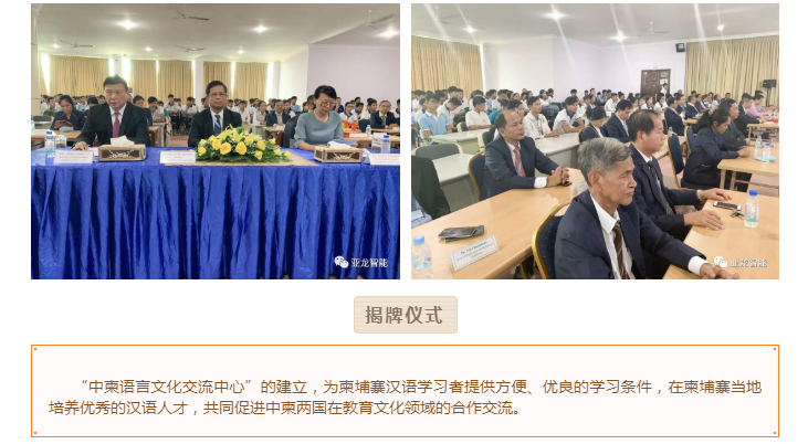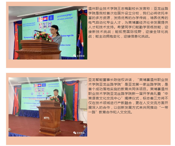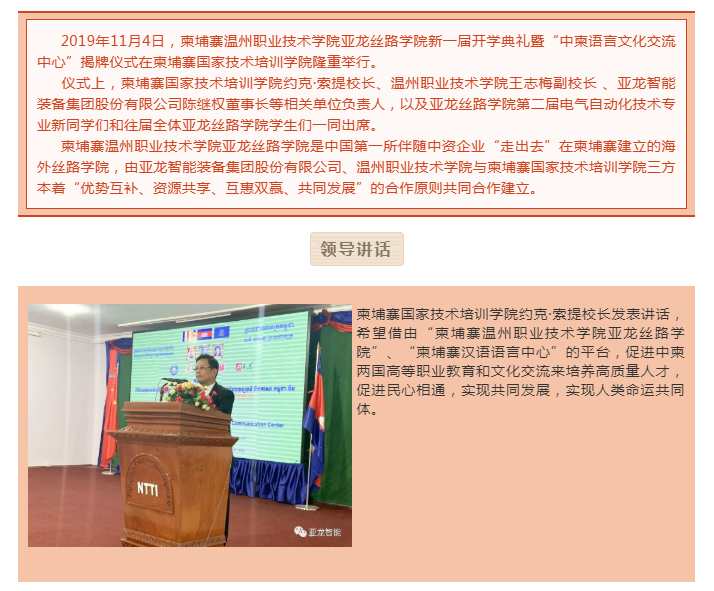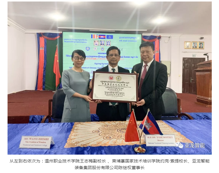 相关链接:创新推动“一带一路”教育合作和人文交流柬埔寨温州职业技术学院亚龙丝路学院新一届开学典礼暨“中柬语言文化交流中心”揭牌顺利举行-新闻动态-亚龙智能装备集团股份有限公司